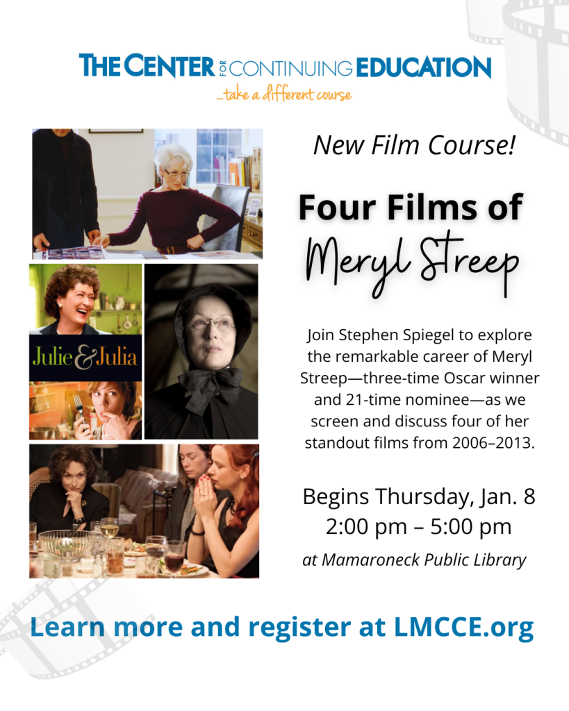 | Four Films of Meryl Streep: Considered to be the Greatest Living Actress | 1/8/2026 – 2/12/2026 | Th | 2:00 PM – 5:00 PM | Register |