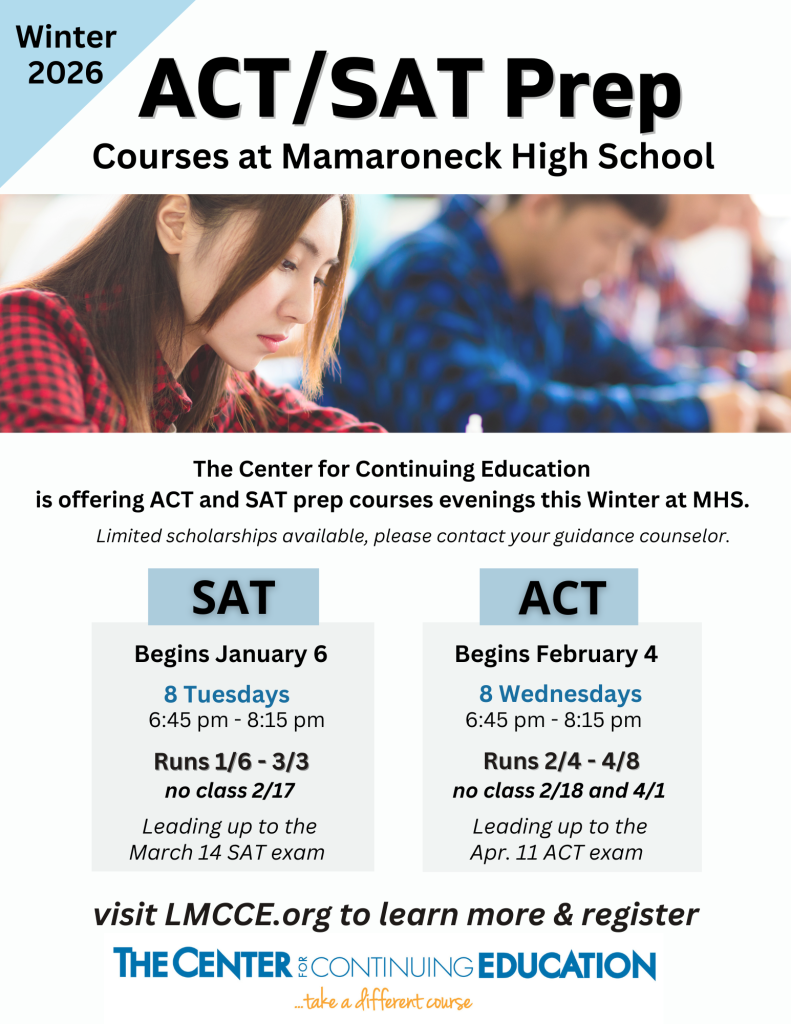 | SAT Test Prep | 1/6/2026 – 3/3/2026 | Tu | 6:45PM – 8:15 PM | Register |
