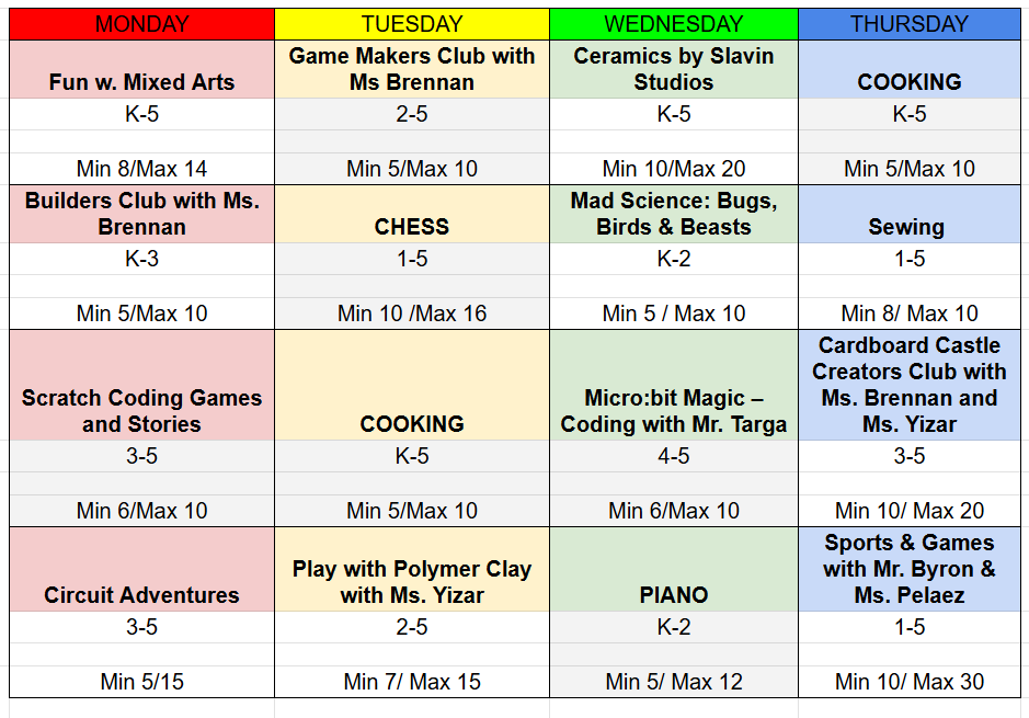 | Cardboard Castle Creators Club with Ms Brennan & Mrs Yizar (3-5) (Grades 3-5) | 01/08/2026 – 03/12/2026 8 classes: 1/8, 1/15, 1/22, 2/5, 2/12, 2/26, 3/5, 3/12 (Make up if needed 3/19) | Th | $315 | Register |