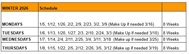 | MONDAYS: | All courses, all days are 3:15 pm – 4:15 pm | |||