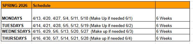 See below for the Spring Schedule:
