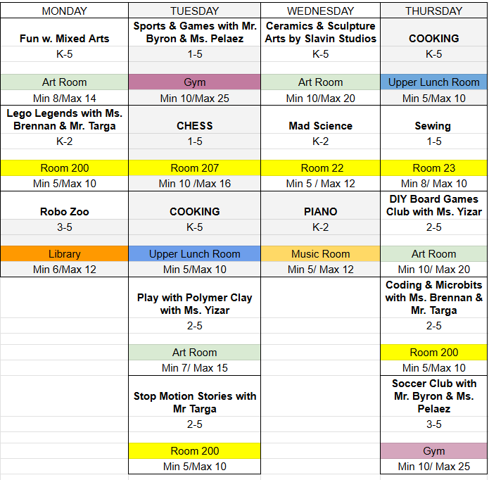 | Soccer Club with Mr. Byron and Ms. Pelaez (Grades 3-5) | 04/16/2026 – 05/28/2026 6 Classes: 4/16, 4/30, 5/7, 5/14, 5/21, 5/28 (Make up if needed 6/4) | Th | $175 | Closed |
